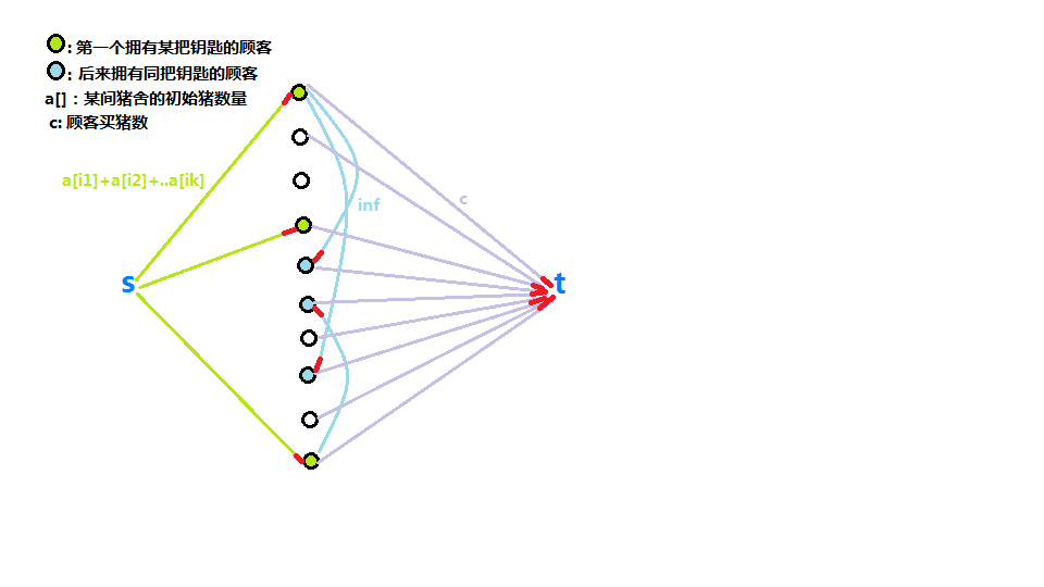 假设当前有a首舞曲。把每个人拆成两个点,从“喜欢”到“不喜欢”连一条容量为k的边。从S往“男孩喜欢”连一条容量为a的边,从“女孩喜欢”往T连一条容量为a的边。然后对于每对男孩女孩,如果不喜欢,则从“男孩不喜欢”到“女孩不喜欢”连一条容量为1的边,否则从“男孩喜欢”到“女孩喜欢”连一条容量为1的边。为什么这个是正确的呢?这样相当于喜欢的人之间限制住了至多跳一首,而最多和k个不喜欢的人跳舞。画图感受一下就好了。如果这a首舞曲都能用到,那么这个网络流应该是满流的。所以二分答案。
