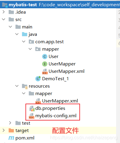 <configuration><properties resource="db.properties"></properties><environments default="development"><environment id="development"><transactionManager type="JDBC"/><dataSource type="POOLED"><property name="driver" value="${driver}"/><property name="url" value="${url}"/><property name="username" value="${username}"/><property name="password" value="${password}"/></dataSource></environment></environments><mappers><mapper resource="com/app/test/mapper/UserMapper.xml"/></mappers>