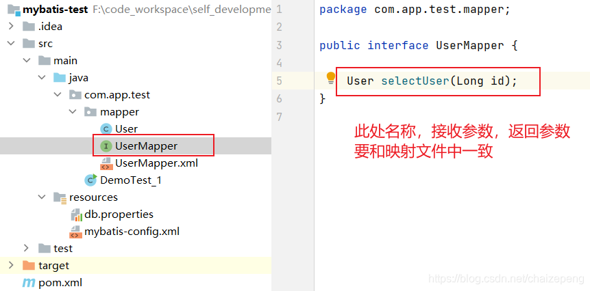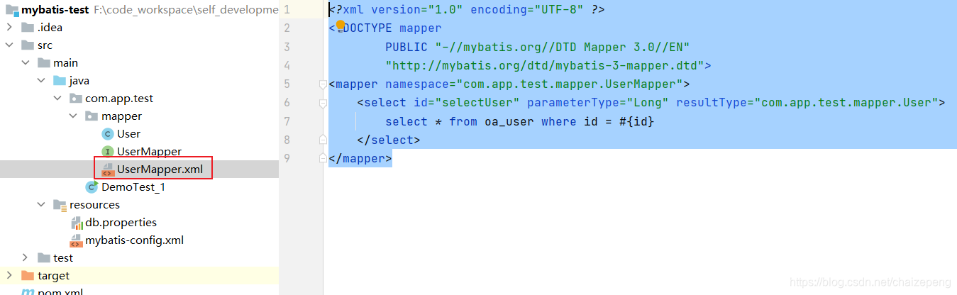 <mapper namespace="com.app.test.mapper.UserMapper"><select id="selectUser" parameterType="Long" resultType="com.app.test.mapper.User">select * from oa_user where id = #{id}</select>