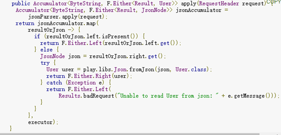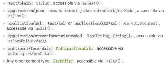 上边是使用play默认的解析器,还允许开发人员写自己的解析器,需要实现 BodyParser 类,具体如下: