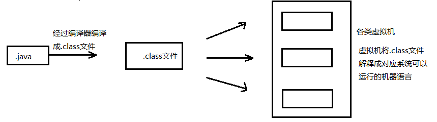 这里主要说一下为什么java是跨平台的,其实这么说并不准确,java毕竟是一门语言,怎么能说语言是跨平台的呢,其实真正跨平台的是java虚拟机,业内称JVM,正因为对应不同的平台有着不同的jvm所以才使得利用java开发的应用可以跨平台运行,其大致原理如下: