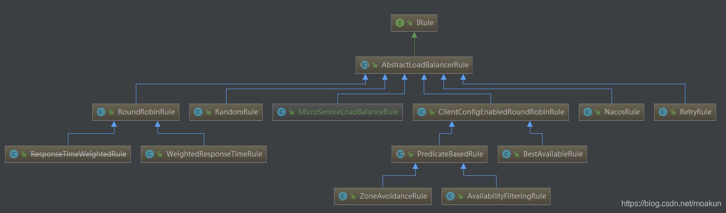 | AvailabilityFilteringRule | 可用过滤策略,先过滤出故障的或并发请求大于阈值的一部分服务实例,然后再以线性轮询的方式从过滤后的实例清单中选出一个; |