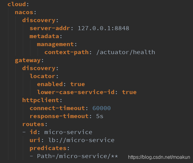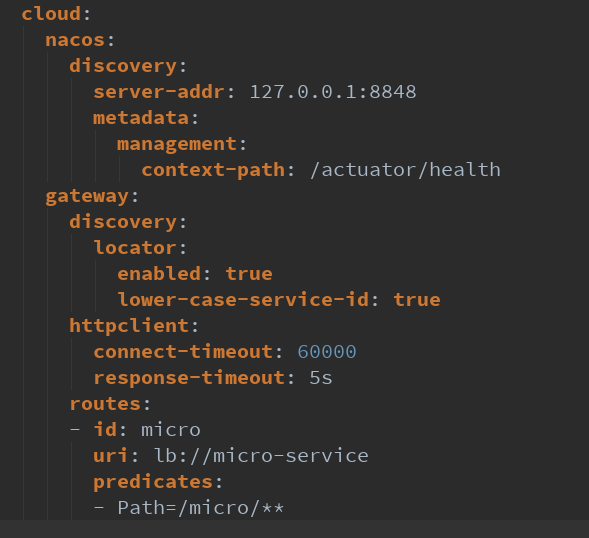 cloud:gateway:routes:- id: micro-serviceuri: lb://micro-servicepredicates:- Path=/micro-service/**filters:- StripPrefix=1
