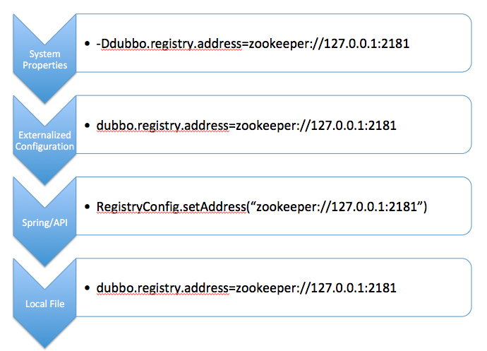 根据驱动方式的不同(比如Spring或裸API编程)配置形式上肯定会有所差异,具体请参考XML配置、Annotation配置、API配置三篇文档。除了外围驱动方式上的差异,Dubbo的配置读取总体上遵循了以下几个原则: