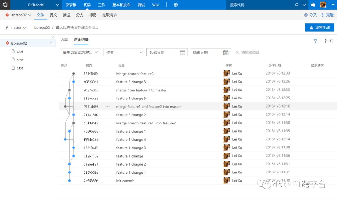 最后,我们可以同步代码到TFS中心存储库,并查看服务器上的历史记录。你会看到与我们的示意图非常类似的图形显示。