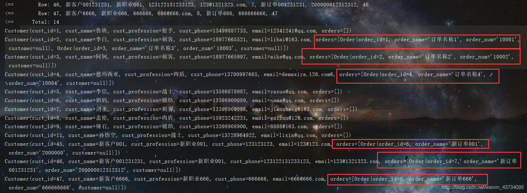 运行结果:每个查询出来的用户,都会再根据他的 cust_id 去查询订单。但是由图可见,会产生很多的 sql 语句。(左连接只需要一句SQL)