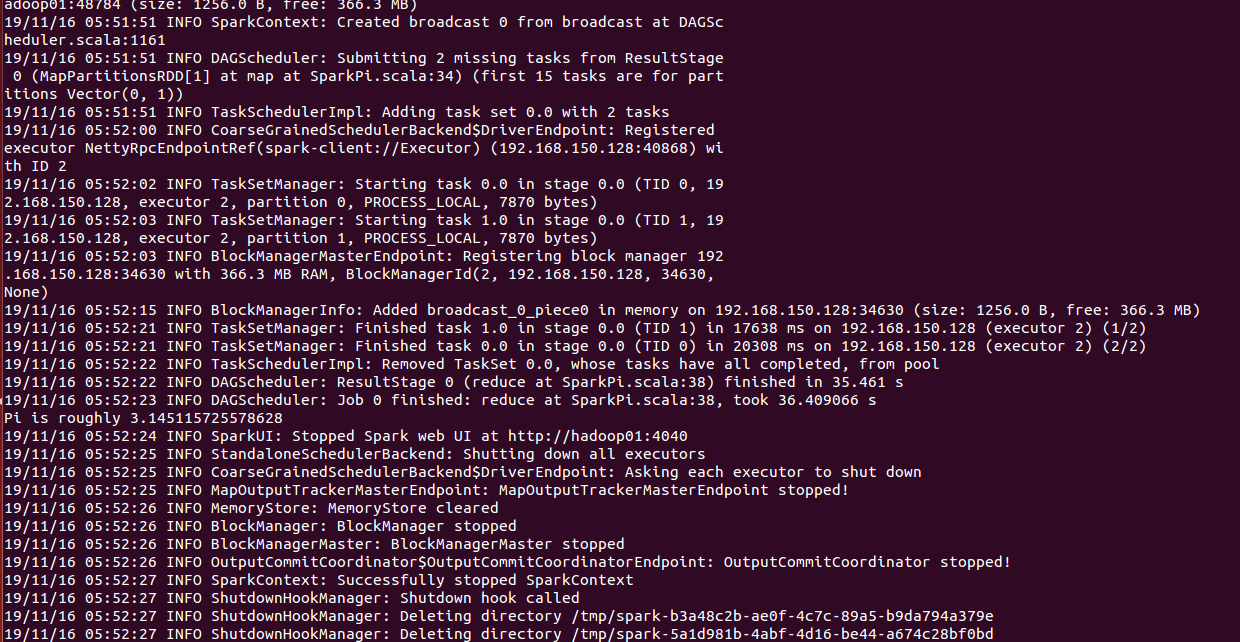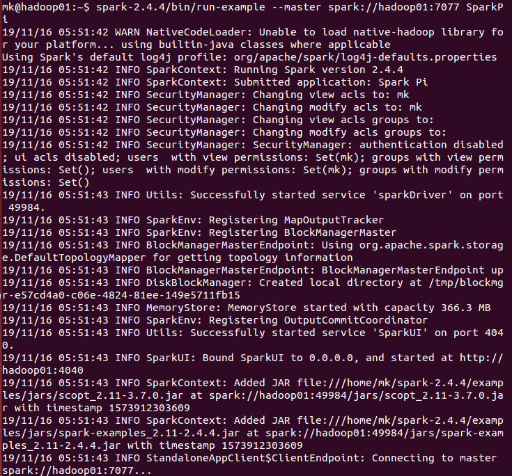 spark-2.4.4/bin/run-example --master spark://hadoop01:7077 SparkPi