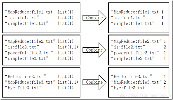 第二,通过一个Reduce过程无法同时完成词频统计和生成文档列表,所以必须增加一个Combine过程完成词频统计。