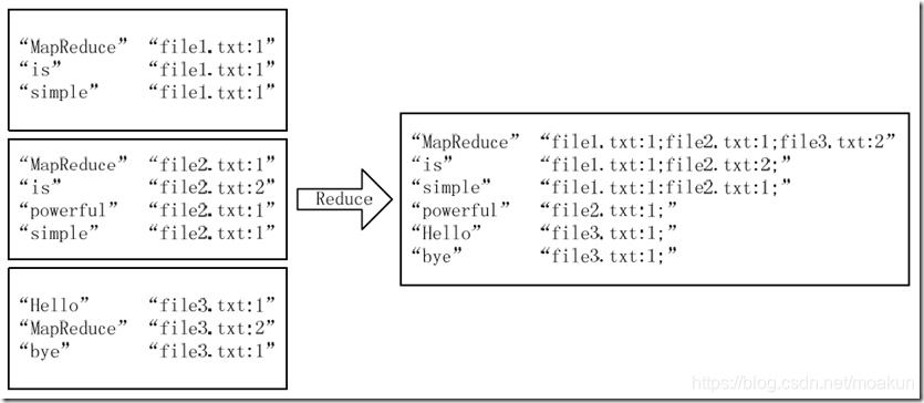 经过上述两个过程后,Reduce过程只需将相同key值的value值组合成倒排索引文件所需的格式即可,剩下的事情就可以直接交给MapReduce框架进行处理了