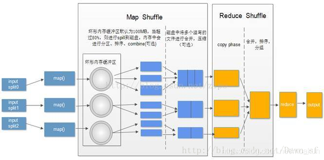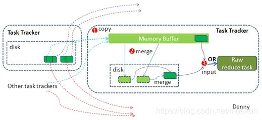 从map端复制来的数据首先写到reduce端的缓存中,同样缓存占用到达一定阈值后会将数据写到磁盘中,同样会进行sort、group等过程。如果形成了多个磁盘文件还会进行合并,最后一次合并的结果作为reduce的输入而不是写入到磁盘中