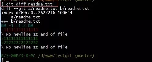 比如我现在在readme.txt文件里面增加一行 内容为555555555555,我们先通过命令查看如下: