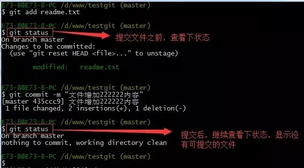 知道了对readme.txt文件做了什么修改后,我们可以放心的提交到仓库了,提交修改和提交文件是一样的2步(第一步是git add 第二步是:git commit)。
