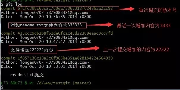 git log命令显示从最近到最远的显示日志,我们可以看到最近三次提交,最近的一次是,增加内容为333333.上一次是添加内容222222,第一次默认是 111111.如果嫌上面显示的信息太多的话,我们可以使用命令 git log –pretty=oneline 演示如下: