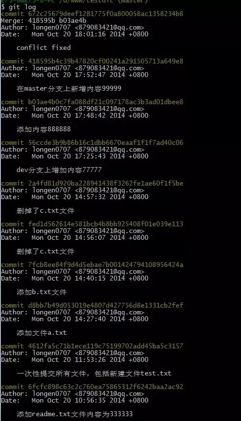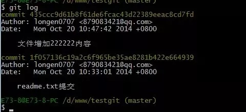 现在我已经对readme.txt文件做了三次修改了,那么我现在想查看下历史记录,如何查呢?我们现在可以使用命令 git log 演示如下所示:
