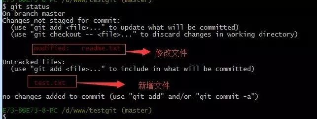 我们在readme.txt再添加一行内容为4444444,接着在目录下新建一个文件为test.txt 内容为test,我们先用命令 git status来查看下状态,如下: