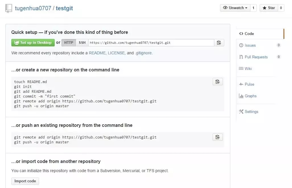 现在,我们根据GitHub的提示,在本地的testgit仓库下运行命令: