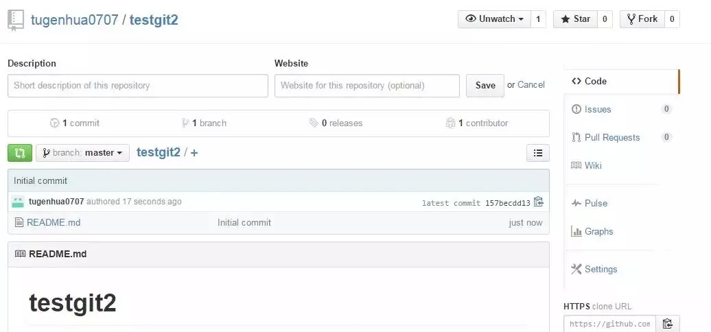 首先,登录github,创建一个新的仓库,名字叫testgit2.如下: