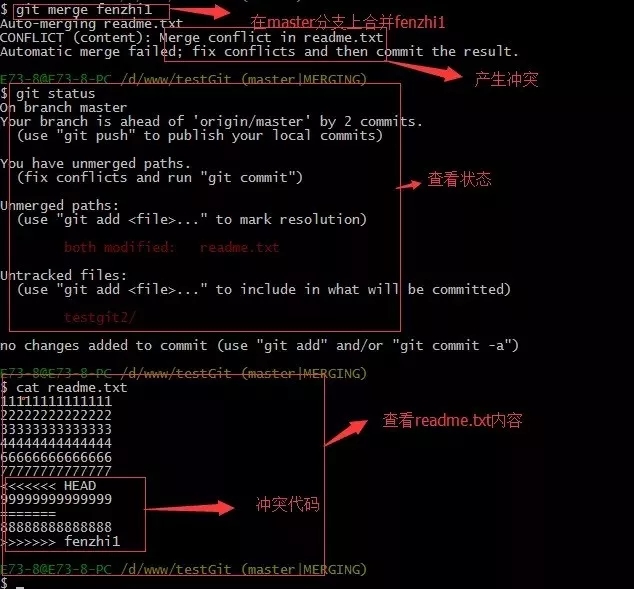 现在我们需要在master分支上来合并fenzhi1,如下操作: