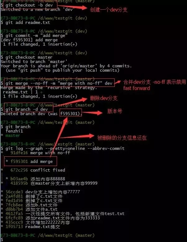合并dev分支,使用命令 git merge –no-ff -m “注释” dev