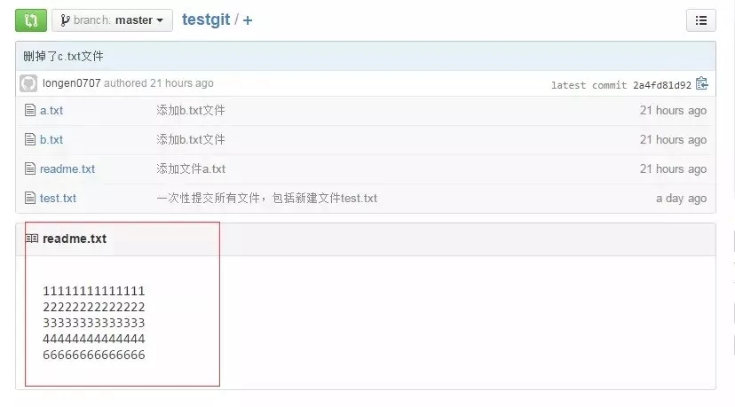 如上可以看到,readme.txt文件内容从一行11111111改成 二行 添加了一行22222222内容。