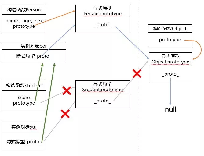 function Person(name,age,sex){this.name = name;this.age = age;this.sex = sex;}function Student(name,age,sex,score){Person.call(this,name,age,sex); this.score = score;}Student.prototype = new Person(); // 这里改变了原型指向,实现继承var stu = new Student("小明",20,"男",99); //创建了学生对象stuconsole.log(stu instanceof Student); // trueconsole.log(stu instanceof Person); // trueconsole.log(stu instanceof Object); // true