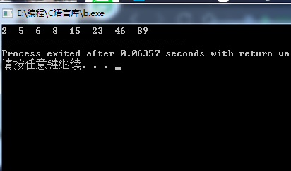 main(){int i,j,t,a[]={2,5,8,6,15,89,55,46};for(i=0;i<7;i++){for(j=0;j<=7-i;j++){if(a[j]>a[j+1]){t=a[j+1];a[j+1]=a[j];a[j]=t;} }}for(i=0;i<8;i++){printf("%d ",a[i]);}