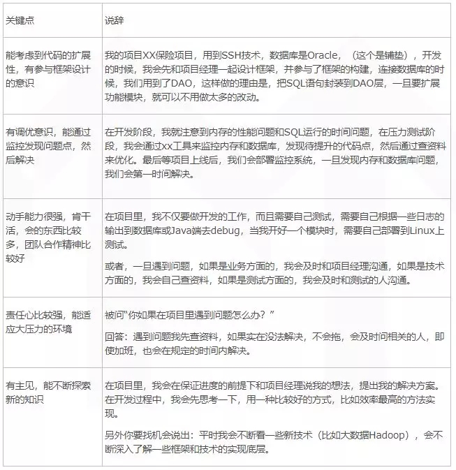 比如:在这个项目里用到了什么技术?你除了说一些基本的技术,比如Spring MVC,Hibernate,还有数据库方面的常规技术时,还得说,用到了Java内存管理,这样能减少对虚拟机内存的压力,或者说用到了大数据处理技术等。也就是说,得找一切机会说出你拿得出手的而且当前也非常热门的技术。