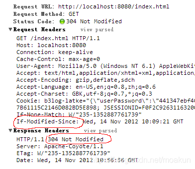 2. 浏览器也很聪明,当你再次(点击链接,或者F5,或者回车,但是不能是ctrl+F5)请求这个资源时,浏览器会询问server这个资源自上次告诉我的最后修改时间以来有没有被修改(请求头中If-Modified-Since)。(见图二)