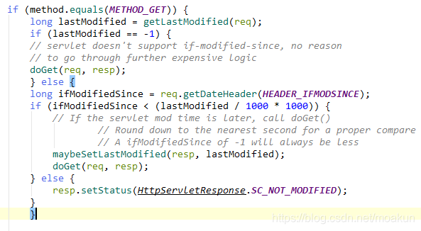 先别沮丧,忘了我们要解释什么问题吗——为什么不要重写service方法。也许你已经猜到了,如果你看看service方法的实现,现在你已经明白了,service方法自己实现了缓存协商的机制,如果我们重写它,反而将这中良好的机制给去掉了。