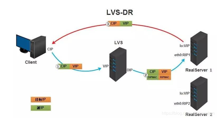 ①.客户端将请求发往前端的负载均衡器,请求报文源地址是CIP(客户端IP),后面统称为CIP),目标地址为VIP(负载均衡器前端地址,后面统称为VIP)。