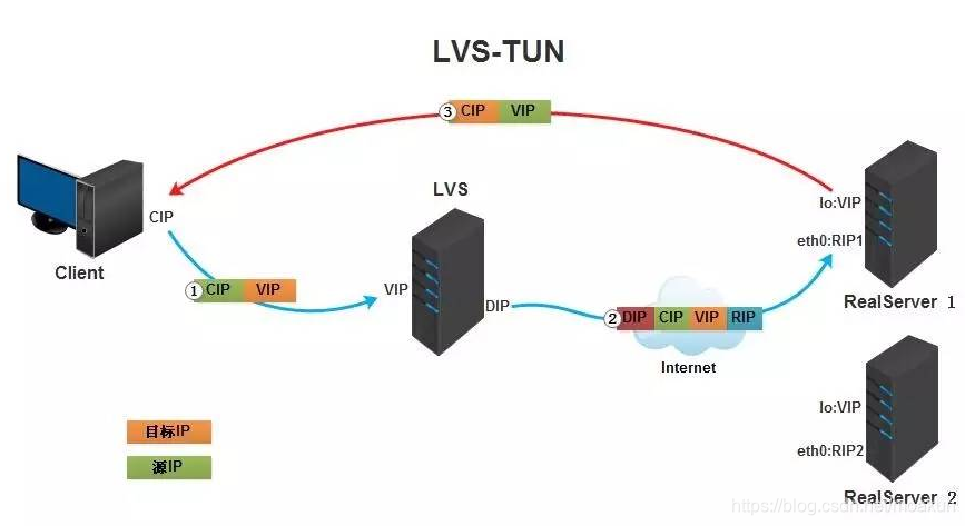 2.TUNNEL 模式的 vip ------>realserver 的包通信通过 TUNNEL 模式,不管是内网和外网都能通信,所以不需要 lvs vip 跟 realserver 在同一个网段内