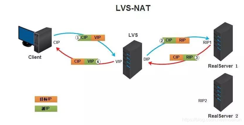 ②.负载均衡器收到报文后,发现请求的是在规则里面存在的地址,那么它将在客户端请求报文的首部再封装一层IP报文,将源地址改为DIP,目标地址改为RIP,并将此包发送给RS。
