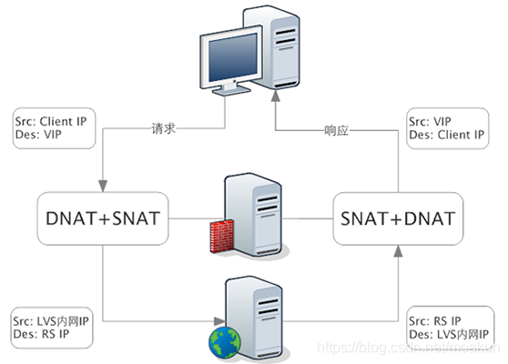 LVS 收到包后,在 NAT 模式修改源地址的基础上,再把 RS 发来的包中的目标地址从 LVS 内网 IP 改为客户端的 IP。
