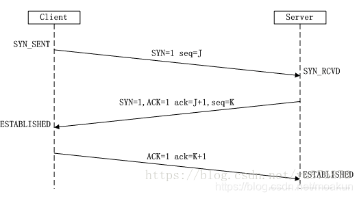 所谓三次握手,即建立TCP连接,需要客户端和服务端总共发送至少三个包确认连接的建立。流程如下