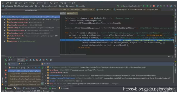 /*** targetClass是com.sun.proxy.$Proxy??即JDK动态代理生成的类* hasIntroductions是false,先不管*/public static boolean canApply(Pointcut pc, Class<?> targetClass, boolean hasIntroductions) {Assert.notNull(pc, "Pointcut must not be null");// 先判断class,这里两个版本都为trueif (!pc.getClassFilter().matches(targetClass)) {return false;}MethodMatcher methodMatcher = pc.getMethodMatcher();// 如果method是固定true,即拦截所有method,则返回true。这里当然为falseif (methodMatcher == MethodMatcher.TRUE) {// No need to iterate the methods if we're matching any method anyway...return true;}// 特殊类型,做下转换,Aspect生成的属于这个类型IntroductionAwareMethodMatcher introductionAwareMethodMatcher = null;if (methodMatcher instanceof IntroductionAwareMethodMatcher) {introductionAwareMethodMatcher = (IntroductionAwareMethodMatcher) methodMatcher;}// 取到目标class的所有接口Set<Class<?>> classes = new LinkedHashSet<Class<?>>(ClassUtils.getAllInterfacesForClassAsSet(targetClass));// 再把目标calss加入遍历列表classes.add(targetClass);for (Class<?> clazz : classes) {Method[] methods = ReflectionUtils.getAllDeclaredMethods(clazz);// 遍历每个类的每个方法,尝试判断是否matchfor (Method method : methods) {if ((introductionAwareMethodMatcher != null &&introductionAwareMethodMatcher.matches(method, targetClass, hasIntroductions)) ||methodMatcher.matches(method, targetClass)) {return true;}}}return false;}
