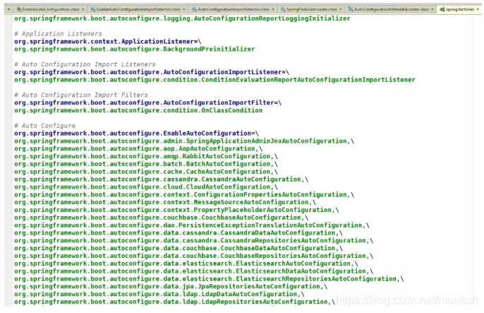重点在于方法getCandidateConfigurations()返回了自动配置类的信息列表,而它通过调用SpringFactoriesLoader.loadFactoryNames()来扫描加载含有META-INF/spring.factories文件的jar包,该文件记录了具有哪些自动配置类。(建议还是用IDE去看源码吧,这些源码单行实在太长了,估计文章中的观看效果很差)