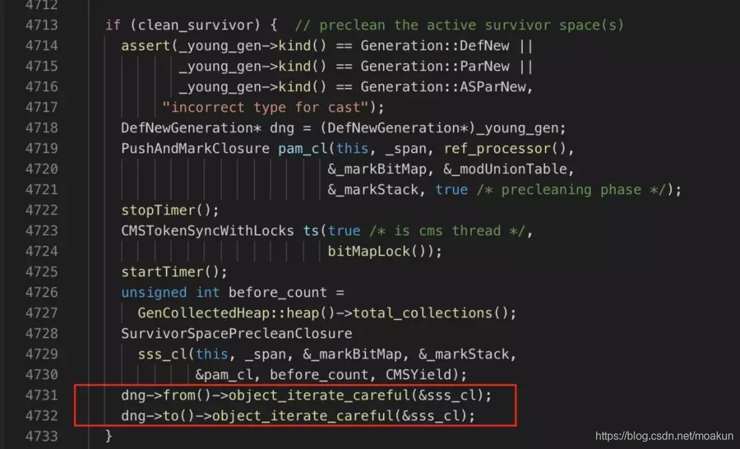 3、预清理:预清理,也是用于标记老年代存活的对象,目的是为了让重新标记阶段的STW尽可能短。这个阶段的目标是在并发标记阶段被应用线程影响到的老年代对象,包括:(1)老年代中card为dirty的对象;(2)幸存区(from和to)中引用的老年代对象。因此,这个阶段也需要扫描新生代+老年代。【PS:会不会扫描Eden区的对象,我看源代码猜测是没有,还需要继续求证】