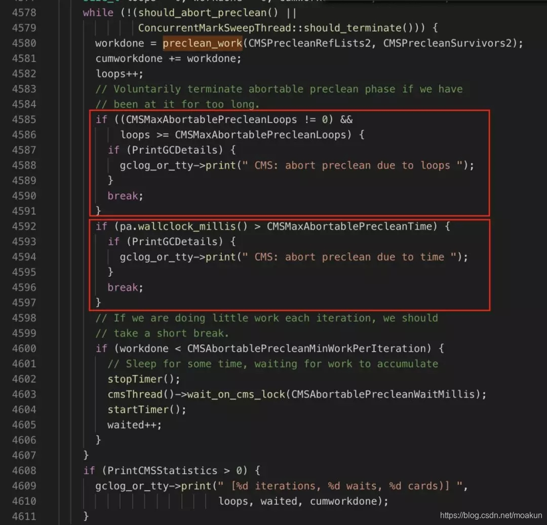 如果不满足上面两个条件,则进入可中断的预清理,可中断预清理可能会执行多次,那么退出这个阶段的出口有两个(源码参见下图):