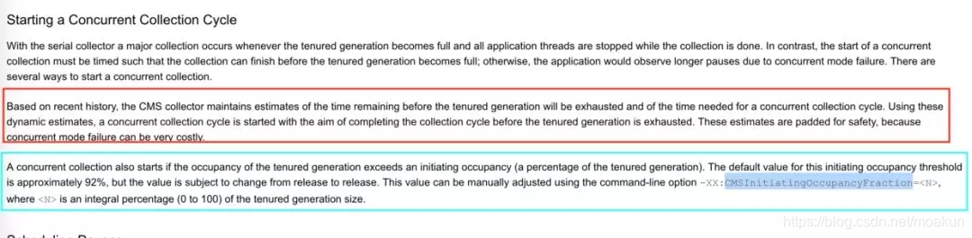 阈值检查机制:老年代的使用空间达到某个阈值,JVM的默认值是92%(jdk1.5之前是68%,jdk1.6之后是92%),或者可以通过CMSInitiatingOccupancyFraction和UseCMSInitiatingOccupancyOnly两个参数来设置;这个参数的设置需要看应用场景,设置得太小,会导致CMS频繁发生,设置得太大,会导致过多的并发模式失败。例如