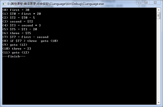 using System.Threading.Tasks;namespace CLanguage {class CLanguage {WordStream wordStream = new WordStream("text.txt");// List<Error> errors = new List<Error>();static void Main(string[] args) {CLanguage syntax = new CLanguage();syntax.SemanticsParser();Console.ReadKey();}/// <summary>/// 语义分析/// </summary>public void SemanticsParser() {do {functionParser();} while(wordStream.ReadNextWord().typeNum != WordPicker.endTypeNumber);if(success) {// Console.WriteLine("成功");foreach(FourFormula f in list) {Console.WriteLine(f);}Console.WriteLine("---finish---");}}/// <summary>/// 函数/// </summary>private void functionParser() {Word word = wordStream.ReadNextWord();//返回类型if(!KeyWords.isReturnType(word)) {addError(word, "返回值错误");}word = wordStream.ReadNextWord();//函数名if(!isIdentifier(word)) {addError(word, "函数名错误");}//(参数){word = wordStream.ReadNextWord();if(word.typeNum != Symbols.left_bracket.typeNum) {addError(word, "(缺失");wordStream.retractWord();}arguments();word = wordStream.ReadNextWord();if(word.typeNum != Symbols.right_bracket.typeNum) {addError(word, ")缺失");wordStream.retractWord();}word = wordStream.ReadNextWord();if(word.typeNum != Symbols.left_curly_bracket.typeNum) {addError(word, "{缺失");wordStream.retractWord();}//语句串statementSequence();//}word = wordStream.ReadNextWord();if(word.typeNum != Symbols.right_curly_bracket.typeNum) {addError(word, "}缺失");wordStream.retractWord();}}/// <summary>/// 参数/// </summary>private void arguments() {Word word = wordStream.ReadNextWord();if(!KeyWords.isType(word)) {if(isIdentifier(word))addBeforeError(word, "参数类型缺失");else {if(wordStream.LastWord().typeNum == Symbols.comma.typeNum)addBeforeError(word, ",多余");wordStream.retractWord();return;}}word = wordStream.ReadNextWord();if(!isIdentifier(word)) {addBeforeError(word, "参数标识符错误");if(word.typeNum == Symbols.right_bracket.typeNum) {wordStream.retractWord();return;}}//逗号word = wordStream.ReadNextWord();if(word.typeNum == Symbols.comma.typeNum) {arguments();}else if(word.typeNum == Symbols.right_bracket.typeNum) {wordStream.retractWord();return;}}/// <summary>/// 判断是否是标识符/// </summary>/// <param name="word"></param>/// <returns></returns>private bool isIdentifier(Word word) {return word.typeNum == WordPicker.identifierTypeNumber;}/// <summary>/// 语串/// </summary>private void statementSequence() {Word word = wordStream.ReadNextWord();while(word.typeNum != Symbols.right_curly_bracket.typeNum && word.typeNum != WordPicker.endTypeNumber) {statement(word);word = wordStream.ReadNextWord();}wordStream.retractWord();}/// <summary>/// 语句/// </summary>/// <param name="word"></param>private void statement(Word word) {if(KeyWords.isType(word)) {defineStatement();}else if(isIdentifier(word)) {assignStatement();}else if(KeyWords.isIfCondition(word)) {ifCondition();}/*else if(KeyWords.isForLoop(word)) {forLoop();}*/else if(KeyWords.isWhileLoop(word)) {whileLoop();}else {addError(word, "多余");}}#region IF语句块/// <summary>/// if条件语句/// </summary>private void ifCondition() {//(Word word = wordStream.ReadNextWord();if(word.typeNum != Symbols.left_bracket.typeNum) {addError(word, "(缺失");wordStream.retractWord();}List<FourFormula> trueList = new List<FourFormula>();List<FourFormula> falseList = new List<FourFormula>();condition(trueList, falseList);//)word = wordStream.ReadNextWord();if(word.typeNum != Symbols.right_bracket.typeNum) {addError(word, ")缺失");wordStream.retractWord();}backPatch(trueList, getNextCodeLine());//回填true分支地址word = wordStream.ReadNextWord();if(word.typeNum == Symbols.left_curly_bracket.typeNum) {//语句块statementSequence();word = wordStream.ReadNextWord();if(word.typeNum != Symbols.right_curly_bracket.typeNum) {addBeforeError(word, "缺少右花括号");wordStream.retractWord();}}else {statement(word);}FourFormula f=addFourFormula();//true分支结束跳转backPatch(falseList, getNextCodeLine());//回填false分支地址elseCondition();//else语句backPatch(f, getNextCodeLine());}/// <summary>/// else语句/// </summary>private void elseCondition() {Word word = wordStream.ReadNextWord();if(word.typeNum != KeyWords.ELSE.typeNum) {wordStream.retractWord();return;}word = wordStream.ReadNextWord();if(word.typeNum == Symbols.left_curly_bracket.typeNum) {statementSequence();word = wordStream.ReadNextWord();if(word.typeNum != Symbols.right_curly_bracket.typeNum) {addBeforeError(word, "缺少右花括号");wordStream.retractWord();}}else {statement(word);}}#endregion/// <summary>/// for循环/// </summary>private void forLoop() {}/// <summary>/// while循环/// </summary>private void whileLoop() {//(Word word = wordStream.ReadNextWord();if(word.typeNum != Symbols.left_bracket.typeNum) {addError(word, "(缺失");wordStream.retractWord();}int startCode = getNextCodeLine();List<FourFormula> trueList = new List<FourFormula>();List<FourFormula> falseList = new List<FourFormula>();condition(trueList, falseList);//)word = wordStream.ReadNextWord();if(word.typeNum != Symbols.right_bracket.typeNum) {addError(word, ")缺失");wordStream.retractWord();}backPatch(trueList, getNextCodeLine());//回填true分支地址word = wordStream.ReadNextWord();if(word.typeNum == Symbols.left_curly_bracket.typeNum) {//语句块statementSequence();word = wordStream.ReadNextWord();if(word.typeNum != Symbols.right_curly_bracket.typeNum) {addBeforeError(word, "缺少右花括号");wordStream.retractWord();}}else {statement(word);}Word w = new Word();w.word = "" + startCode;addFourFormula(w, null, null, null);backPatch(falseList, getNextCodeLine());}/// <summary>/// 条件语句/// </summary>private void condition(List<FourFormula> trueList, List<FourFormula> falseList) {boolExpressStatement(trueList, falseList);}/// <summary>/// 获取下一行地址编号/// </summary>/// <returns></returns>private int getNextCodeLine() {return list.Count;}/// <summary>/// 回填跳