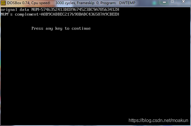 datas segmentNUM DB 12H,34H,56H,78H,9AH,0BCH,23H,45HDB 67H,89H,0DEH,13H,24H,35H,46H,57HN DB $-NUMoutputNUM db "orignal data NUM=$"outputNUMC db 0dh,0ah,"NUM's complement=$"