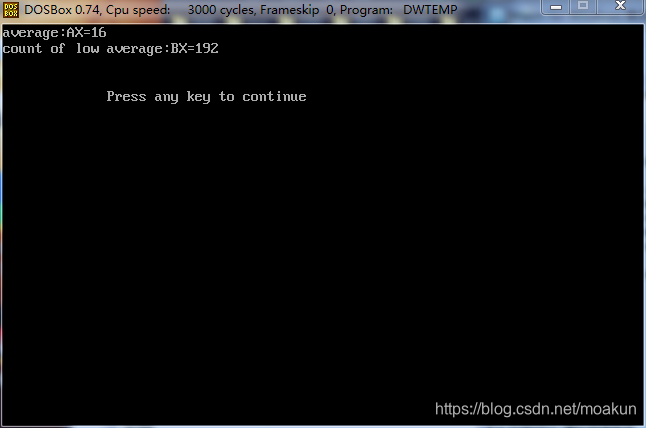 datas segmentDATA dw 10h dup(1,2,3,4,-1,5,7,-99,29,-11,294,-21,45,6,57,-54)average dw 0countOfLowAverage dw 0outputAverage db 'average:AX=$'outputCountOfLowAverage db 0dh,0ah,'count of low average:BX=$'