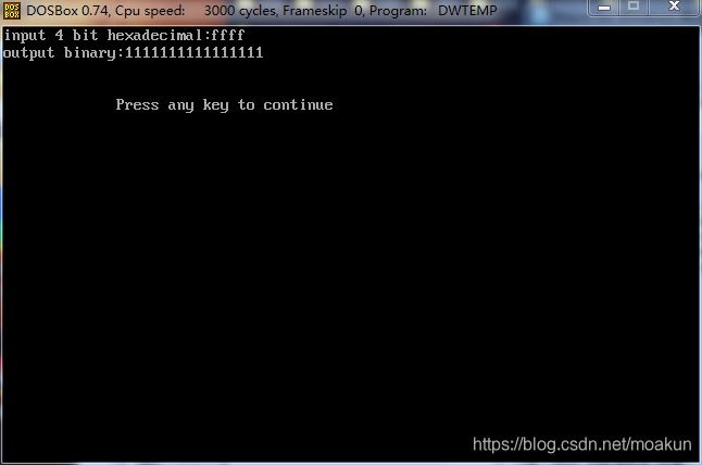 datas segmentmaxLength db 5hexLength db 0hex db 5 dup(?)bin db 100h dup(?)inputPrompt db 'input 4 bit hexadecimal:$'outputBinary db 0dh,0ah,'output binary:$'outputInputError db 0dh,0ah,'input error!$'datas endsstacks segment stackdb 100h dup(?)stacks endscodes segmentassume cs:codes,ds:datas,ss:stacks