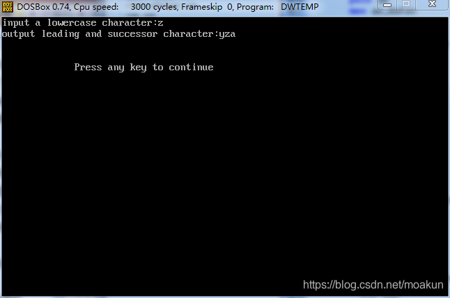 start:push dsmov ax,0hpush axmov ax,datas ;初始化dsmov ds,axlea dx,inputPrompt ;输出输入提示mov ah,9int 21hmov ah,1int 21hcmp al,'a' jae s1 ;如果al>='a',则跳转s1,判断是否al<='z'jmp s3 ;否则跳s3s1: cmp al,'z'jbe lowercaseCharacter ;如果al<='z',则al转大写字母jmp s3 ;否则跳s3lowercaseCharacter:mov a,allea dx,outputPrompt ;输出前导字母和后继字母提示mov ah,9int 21h;lea dx,outputLeadingCharacterPrompt ;输出前导字母提示;mov ah,9;int 21hmov al,a ;输出前导字母mov ah,0add ax,26-'a'-1mov bl,26div blmov dl,ahadd dl,'a'mov ah,2int 21hmov dl,a ;输出输入字母mov ah,2int 21h;lea dx,outputSuccessorCharacterPrompt ;输出后继字母串提示;mov ah,9;int 21hmov al,a ;输出后继字母mov ah,0add ax,26-'a'+1mov bl,26div blmov dl,ahadd dl,'a'mov ah,2int 21hjmp exit s3:lea dx,outputErrorPrompt ;输出输入无效mov ah,9int 21hexit:retmain endp