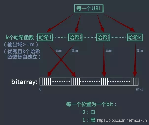 那么如何判断一个 url 在黑名单里面呢?输入一条 url,它经过上述处理之后,会得到多个数组的下标位置。如果这些下标的元素值都已经为 1 了,说明该在黑名单里面,否则不在。