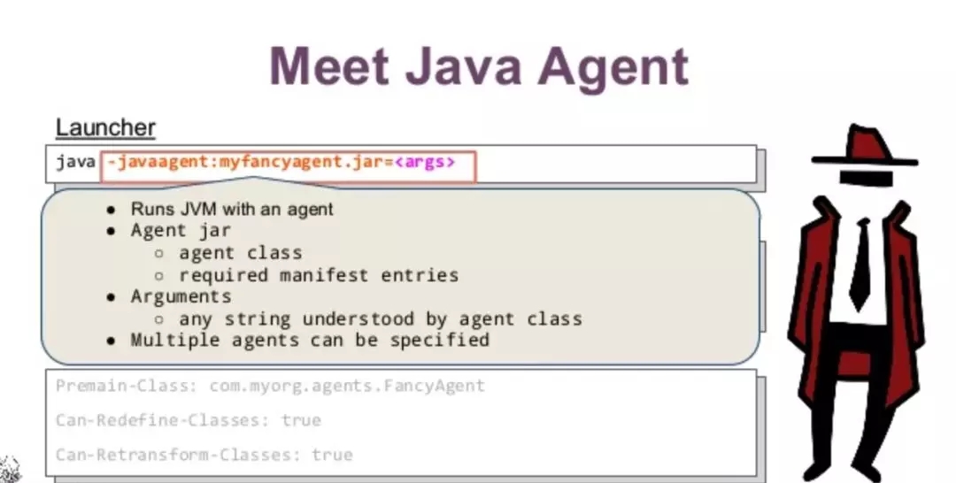 这里需要解释下为什么要指定 Agent-Class和 Premain-Class,在加载Java Agent之后,会找到 Agent-Class或者 Premain-Class指定的类,并运行对应的 agentmain或者 premain方法。