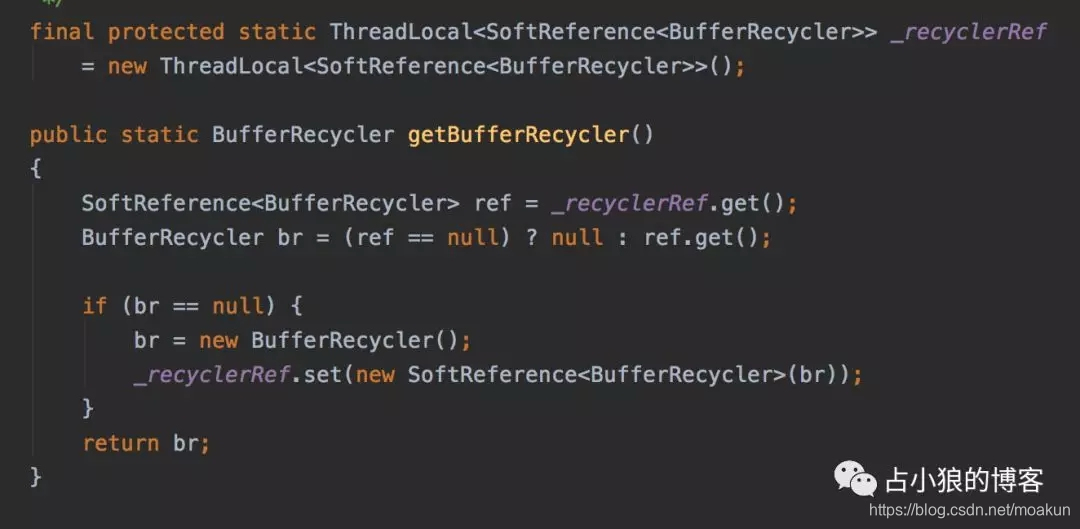 jackson在序列化的时候,需要开辟一块内存空间,为了能够重复利用这块空间,jackson默认把这个内存空间封装成一个SoftReference保存在ThreadLocal中。