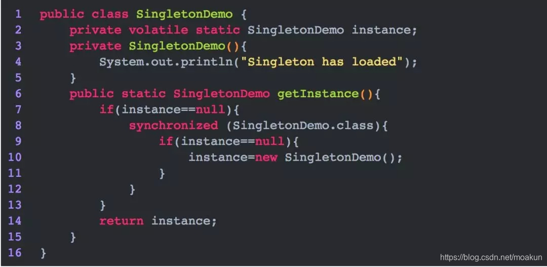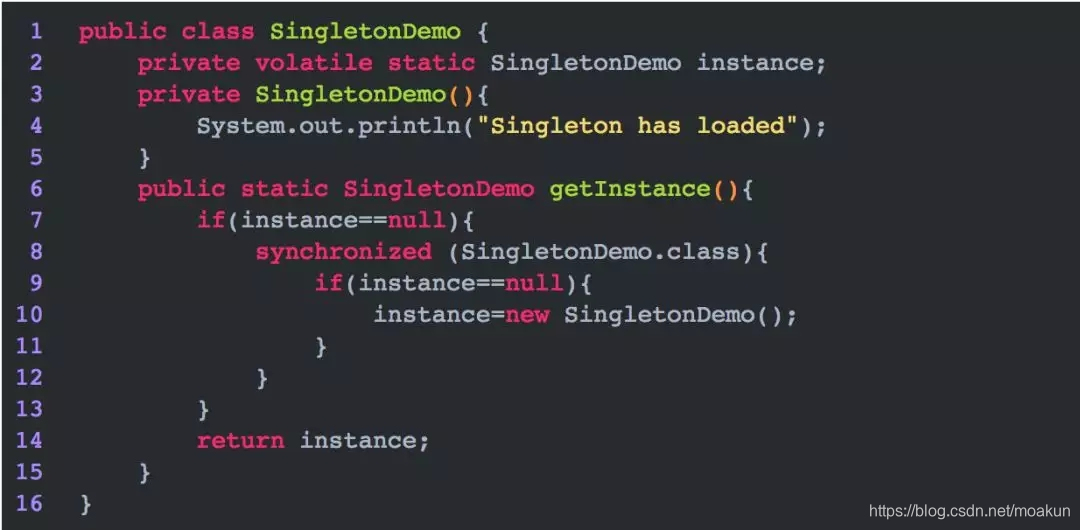 答:这个之前准备过,我写了一个双重锁的单例模式。