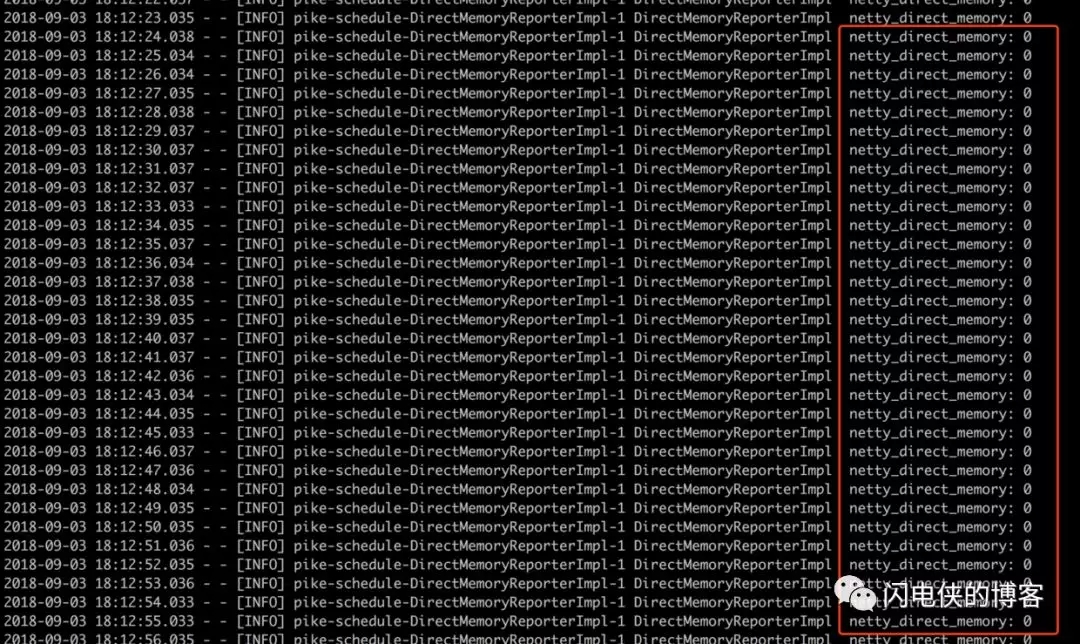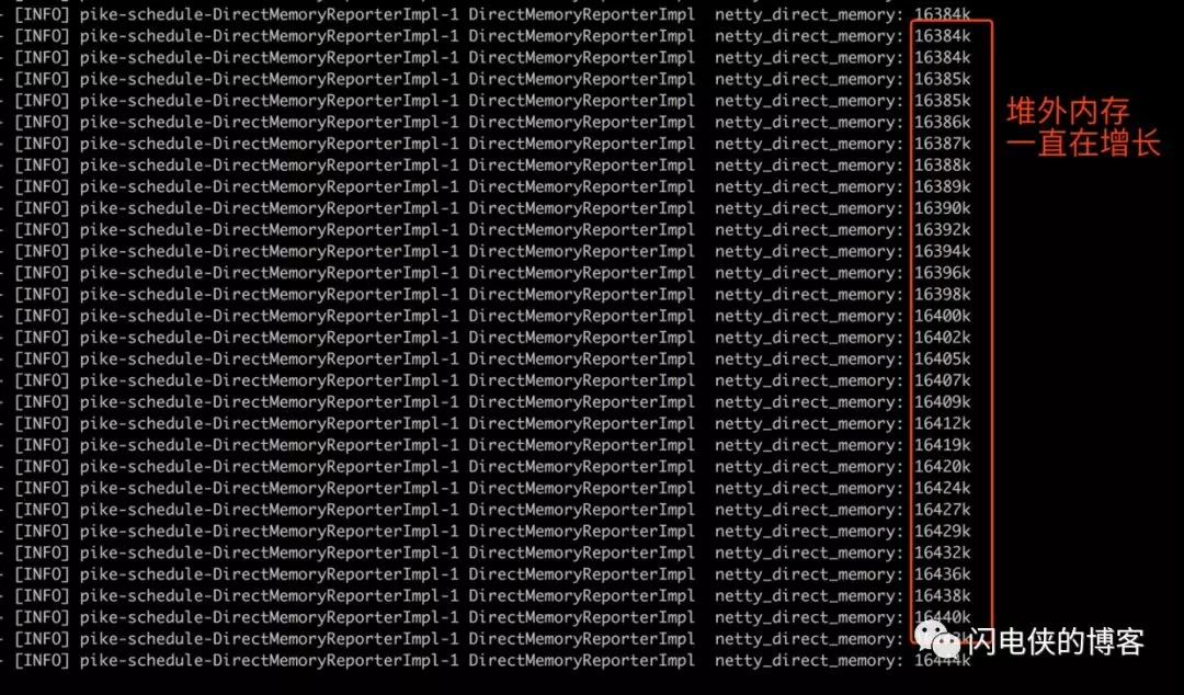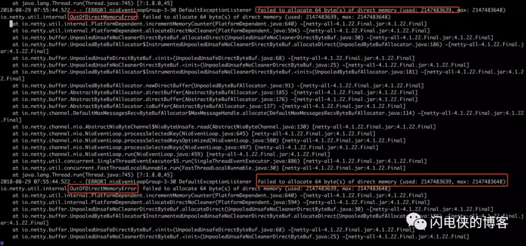在极短的时间内,狂打 failed to allocate64(bytes)of direct memory(...)日志(瞬间十几个日志文件,每个日志文件几百M),日志里抛出一个 netty 自己封装的 OutOfDirectMemoryError,说白了,就是堆外内存不够用了,netty 一直在喊冤。