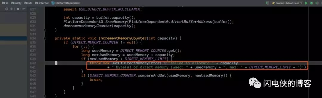 这个地方,是一个对已使用堆外内存计数的操作,计数器为 DIRECT_MEMORY_COUNTER,如果发现已使用内存大于堆外内存的上限(用户自行指定),就抛出一个自定义 OOM Error,异常里面的文本内容正是我们在日志里面看到的。